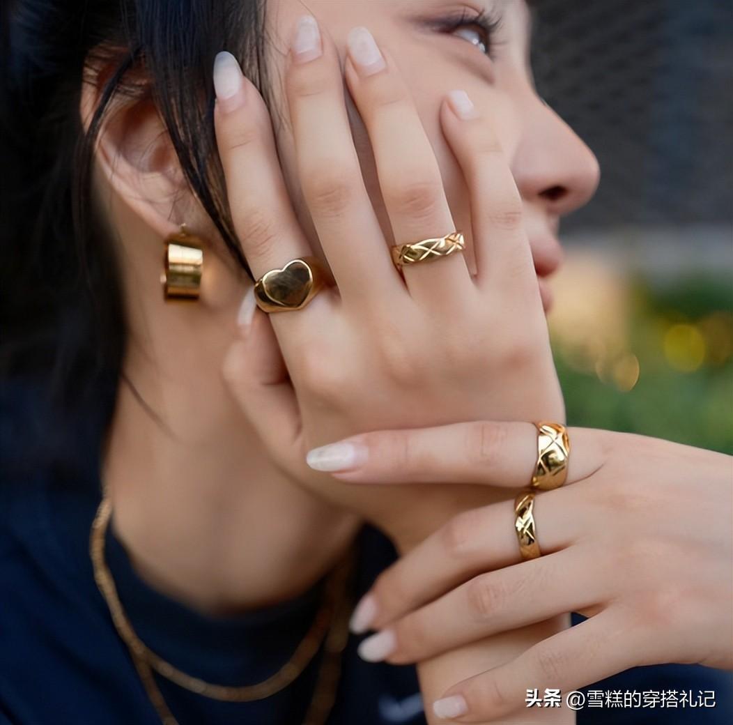 除了金屬素圈耳飾之外,金屬飾品還能做成戒指,它能讓手指變得更精緻修長,塑造知性中性美。金屬戒指用在手上不要只有一個,而是多個,這樣纔不會顯得單調,多個金屬戒指選寬度不同款,細微的不同變得多層次,戴起來不呆板。