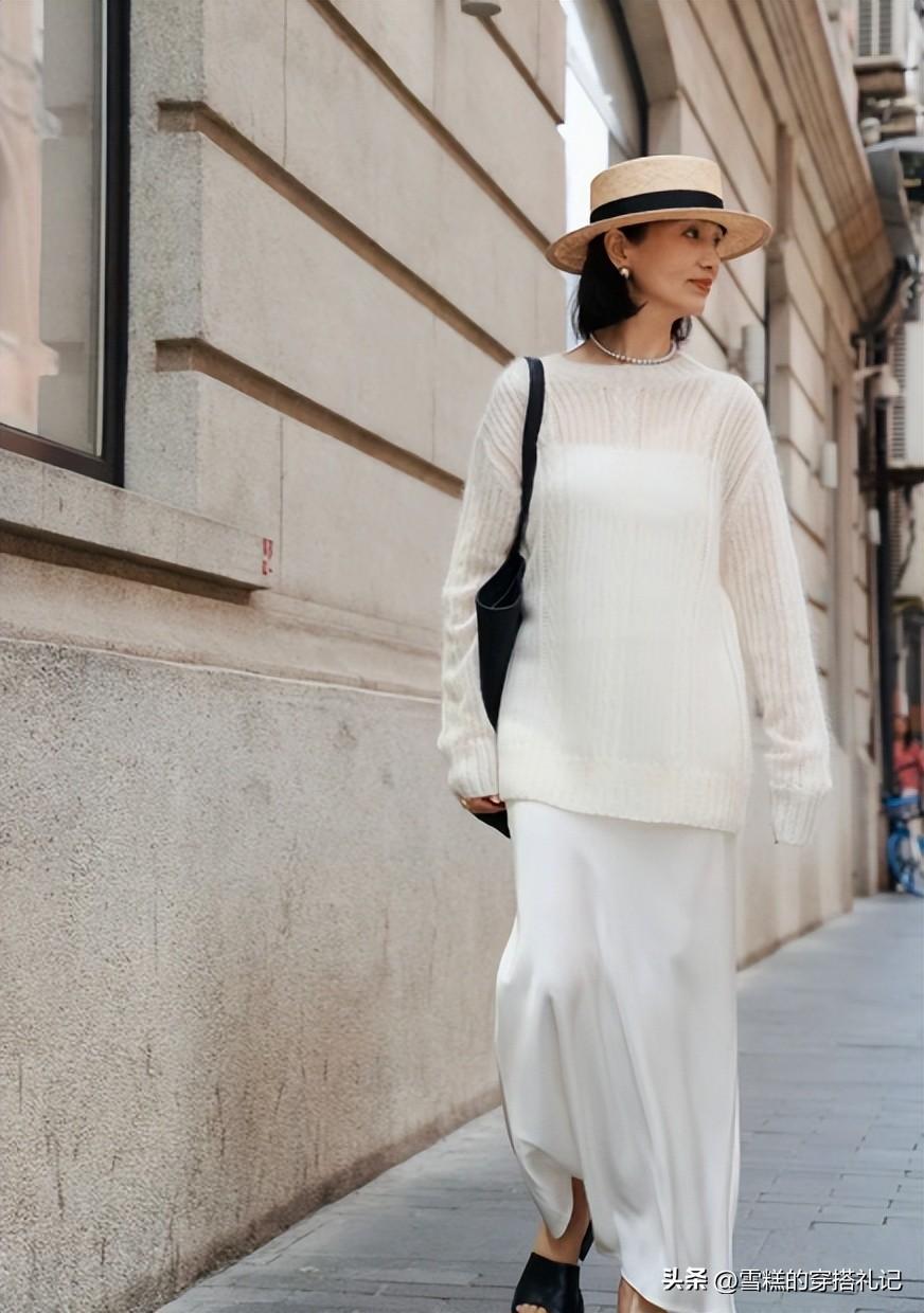 ❶法式復古風:針織衫+緞面裙+珍珠飾品