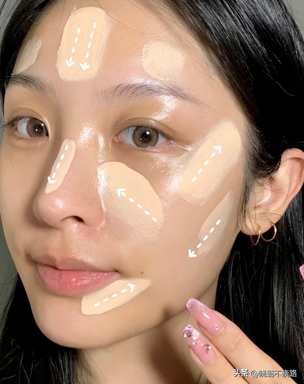 打底妝就需要粉底,而粉底避免塗得太厚重,儘量全臉點開,這樣能避免粉底的厚重感,打造出輕薄透氣的底妝。針對有瑕疵的地方,疊加少量粉底液,得到遮瑕液不顯厚重的效果。
