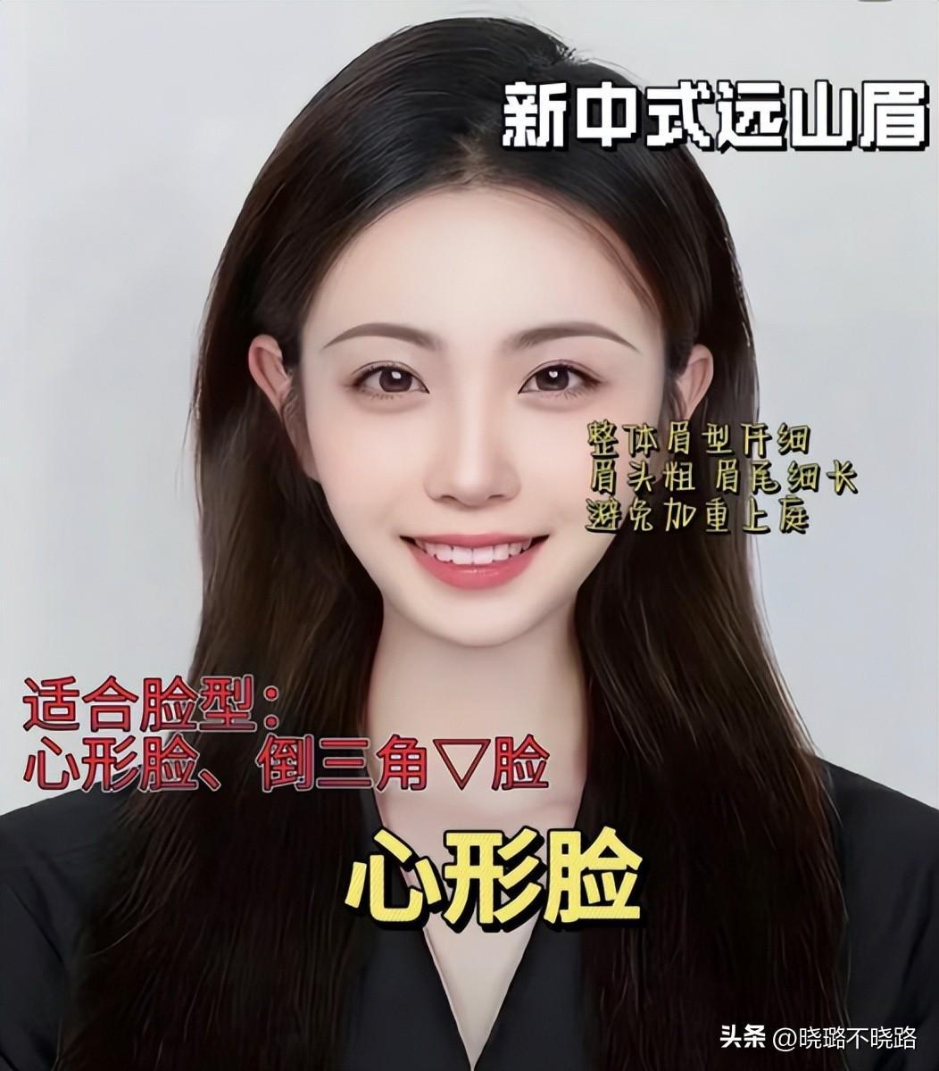 典型的美人胚臉型是心形臉和倒三角臉,選大部分的眉形都不會難看到哪裏去,但是可以挑戰帶點獨特設計的眉形,比如新中式遠山眉,凸顯出女人的優雅溫和,眉形是細長型,但是還是有眉頭粗眉尾細的特點,要避免加重上庭。