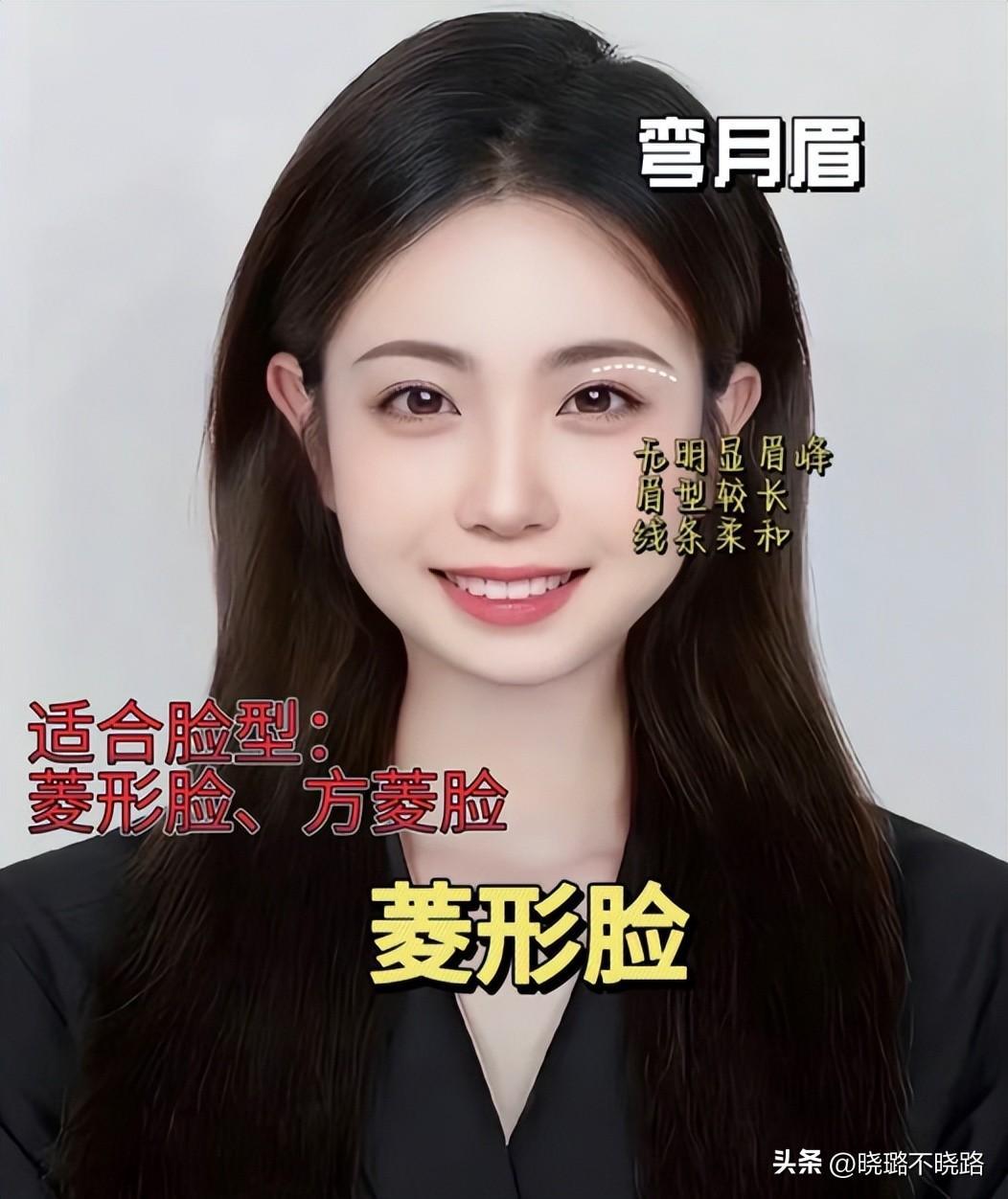 菱形臉下顎線寬,太陽穴窄顴骨高,整個臉型是沒有前面兩款流暢,畫眉毛需要避免明顯的眉峯設計,減少面部的折角。推薦月彎眉,線條柔和,眉形較長,延長太陽穴,化解凹陷問題。