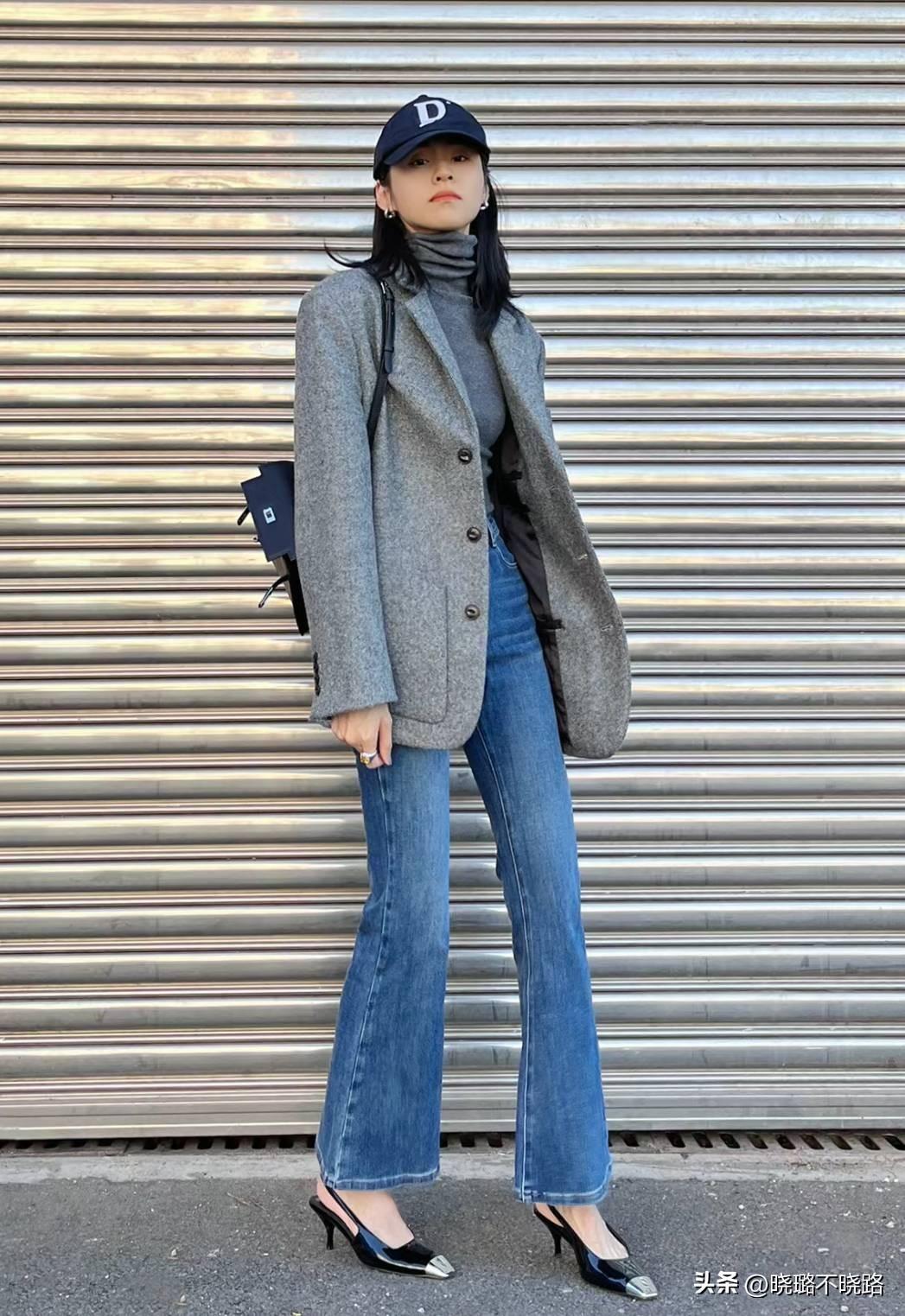 胯寬臀肥也不能太着急,一件遮臀長度的外套,搭配“上窄下寬”的微喇褲,便可以輕輕鬆鬆的凹出曲線感。