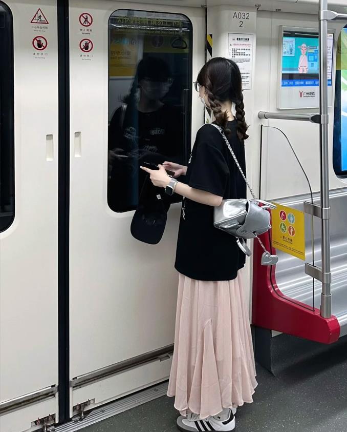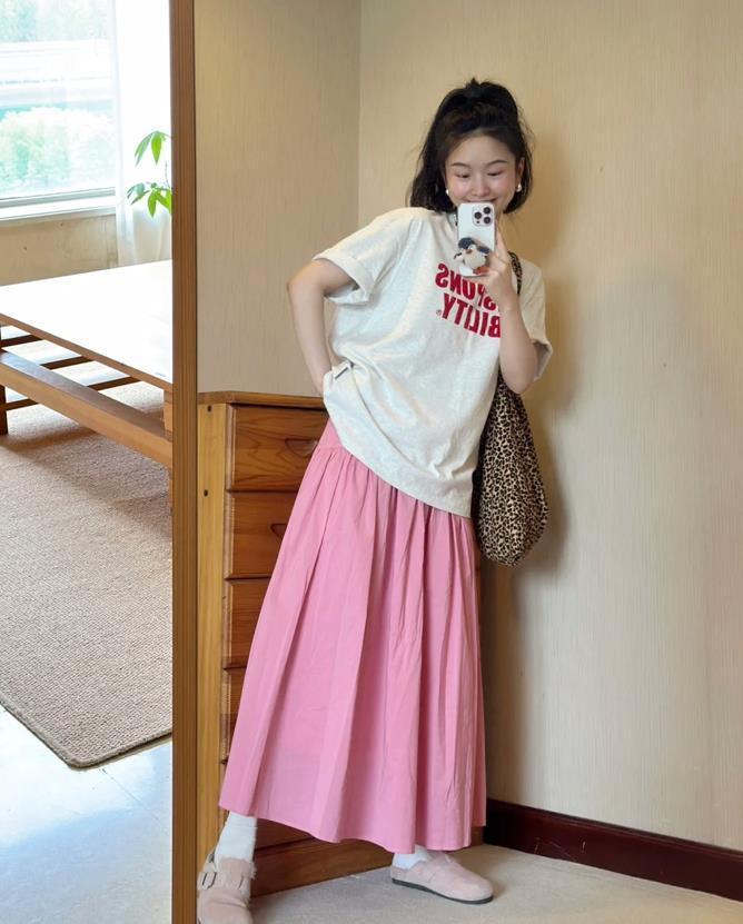 喜歡這種版型寬鬆的大t恤,和半身長裙組合在一起真的好搭啊,重點是能夠遮掩住身上的缺點,粉色和白色的配色組合,少女範十足,還超級減齡。