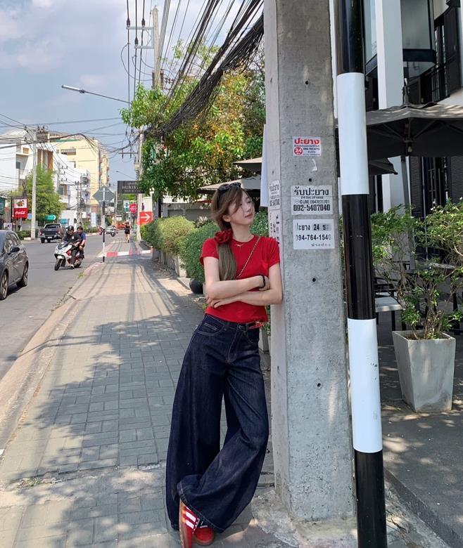 T恤和牛仔褲纔是夏天正確的打開方式,紅色短袖t恤,穿起來也太顯洋氣和吸睛了,配牛仔藍闊腿褲,更多了幾分隨性休閒感。