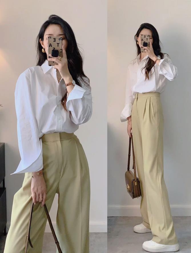 白襯衫配西裝褲,那可是永遠的精緻優雅,簡約大方又不失氣質的白襯衫,在穿的時候,稍微將袖子挽起來一點,就可以營造出隨性範。下身搭配一條休閒西裝褲,顯瘦又顯腿長。