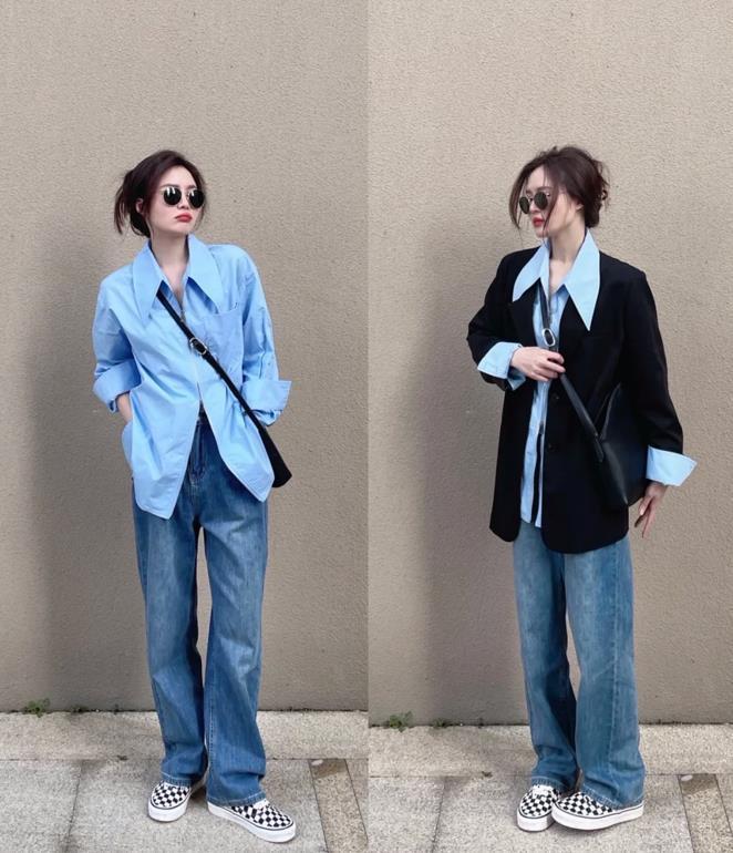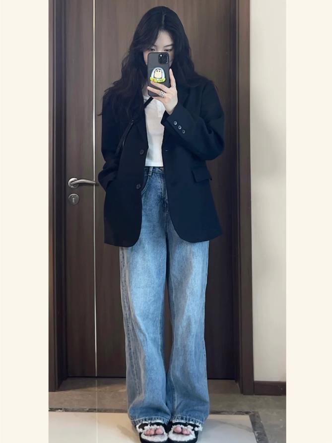 喜歡穿搭帶來的那種鬆弛感,黑色西裝外套+牛仔拖地褲,真的太好看了,寬鬆的版型,對身材也起到很好的包容性,藏肉且顯瘦。
