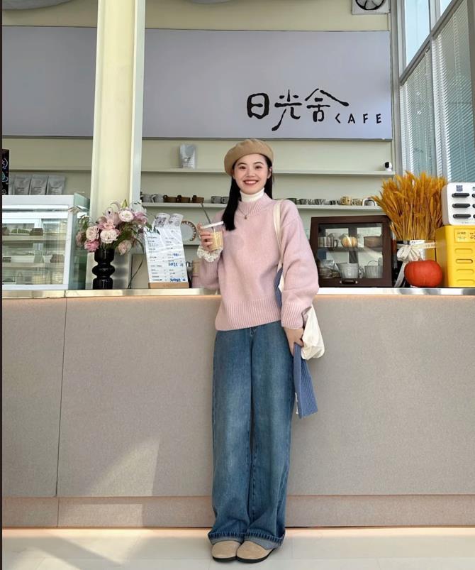 150+的女生就應該學習下這種穿搭,淡淡粉色毛衣穿起來也太好看了吧,褲子是牛仔拖地褲,版型很不錯,顯瘦效果非常好。