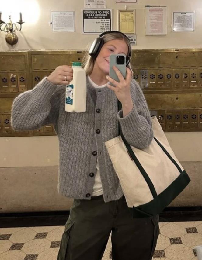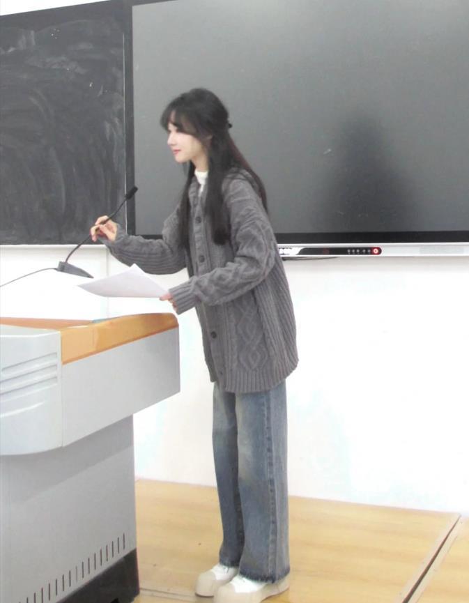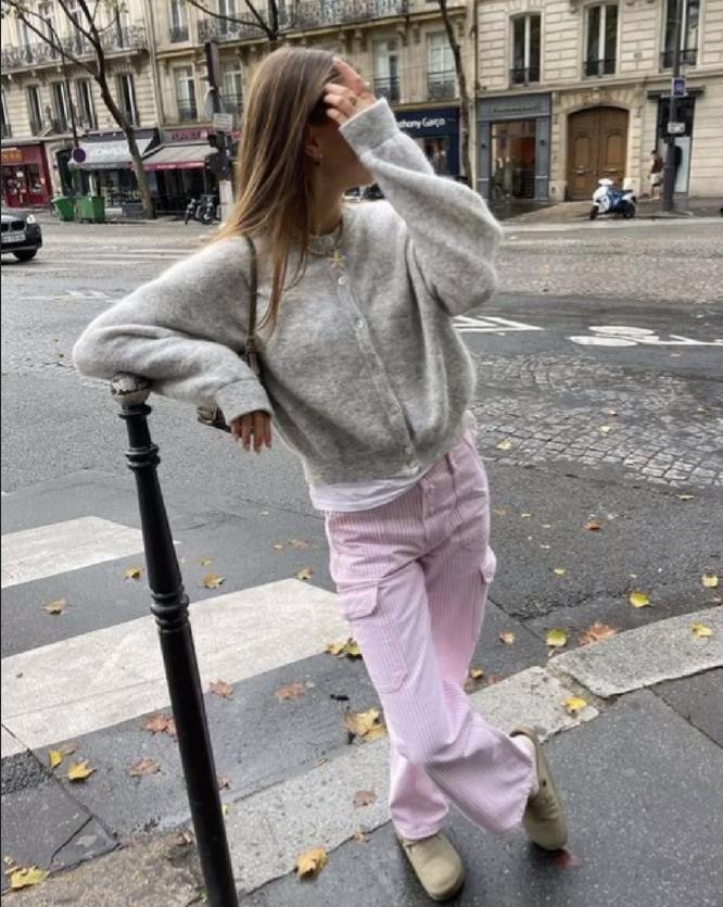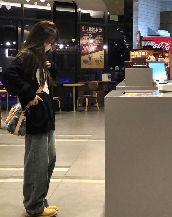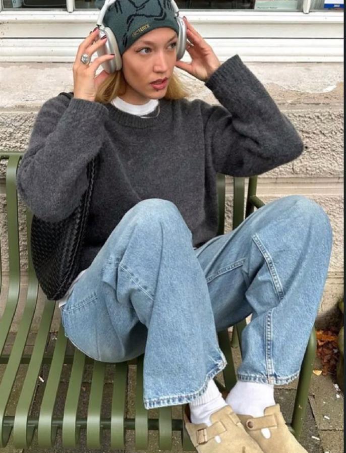 灰色寬鬆毛衣真的是很時髦百搭啊,也能輕鬆打造出高級感,搭配同樣寬鬆的牛仔拖地褲,有種很溫柔的鬆弛感。