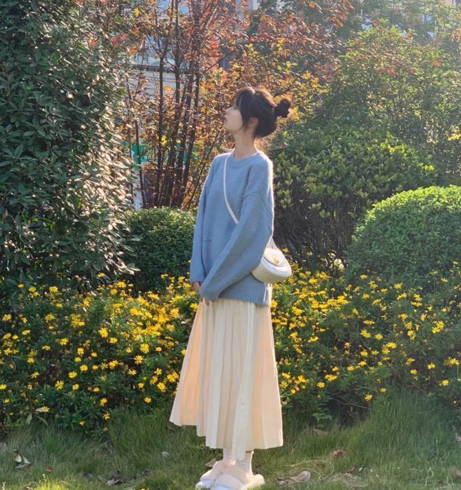 這套看起來好溫柔啊,喜歡這個配色,藍白組合,真的清爽又幹淨,好看到沒話說。毛衣和長裙的版型都是寬鬆的,鬆弛感的穿搭,真的多了幾分隨性。