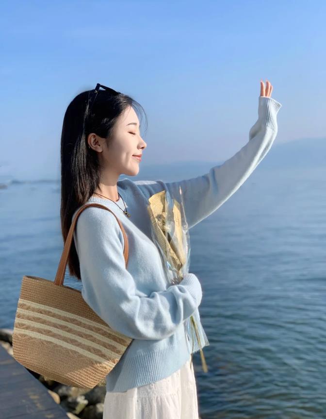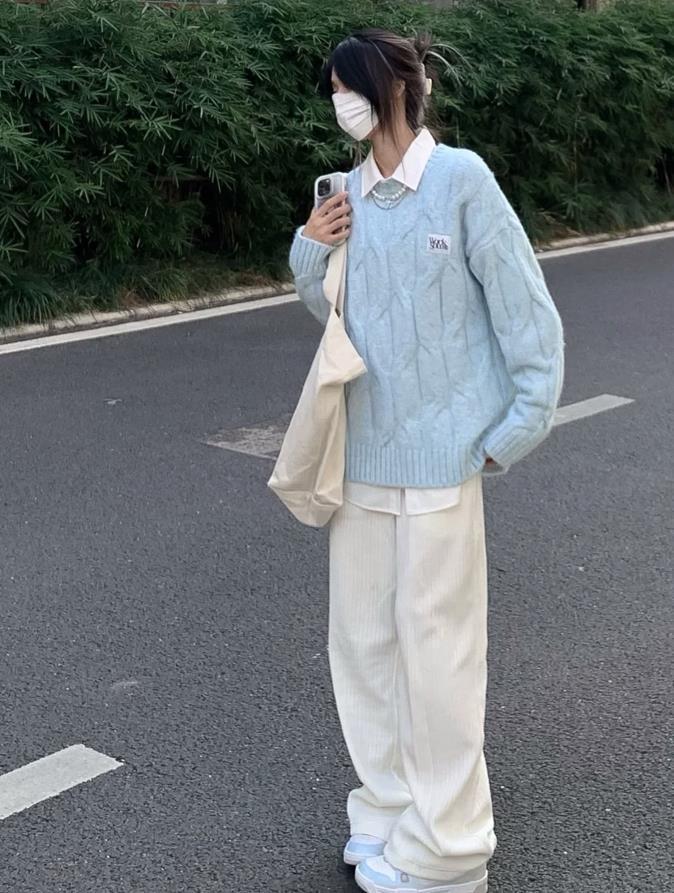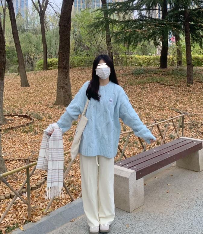就拿淺藍色毛衣來說,這個低飽和度配色的毛衣,穿起來不僅襯膚色,還顯白,比起深藍色,淺藍色的毛衣更能讓你穿出白皙的效果,同時也不挑膚色。