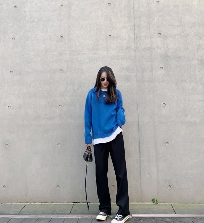 話說回來,藍色系的毛衣也太顯白了吧,內搭一件白色t恤,它們都是寬鬆的版型,組合在一起就有種很鬆弛的效果。加上一條黑色直筒西裝褲,顯瘦又顯腿長。