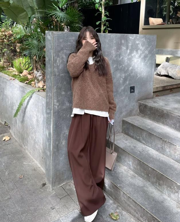 美拉德色系的穿搭,可不僅僅是屬於秋冬的,在春天也可以這麼穿,棕色系毛衣,裏面疊穿一件白色t恤,很顯層次感也時髦。搭配同色系的闊腿褲日常又休閒。