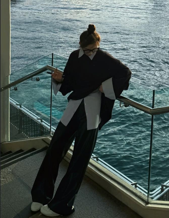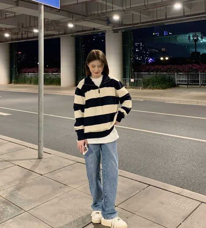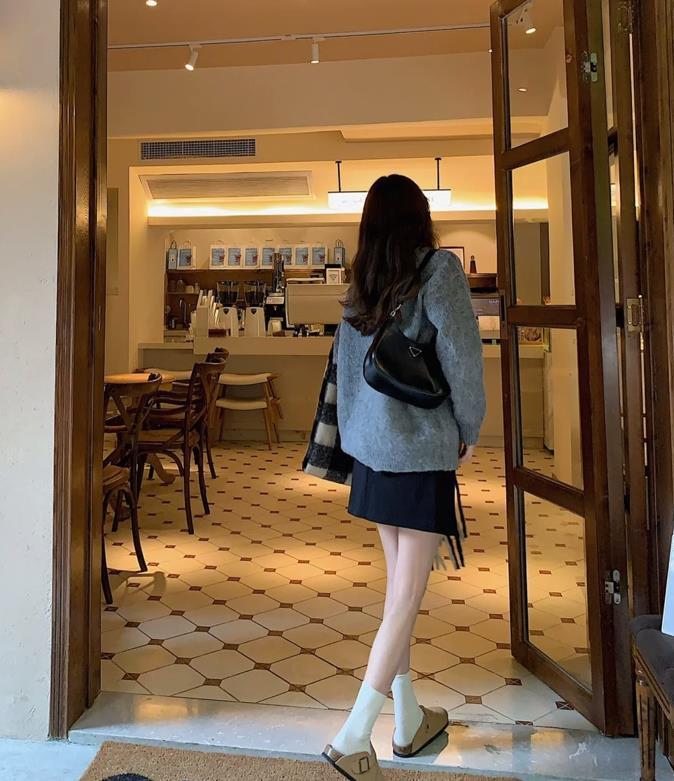 黑色毛衣+藍襯衫疊穿,層次感十足,又減齡,記得要露出襯衫衣領和下襬,這樣才能更好打造出層次。一整套的穿搭都是寬鬆的,鬆弛又放鬆。