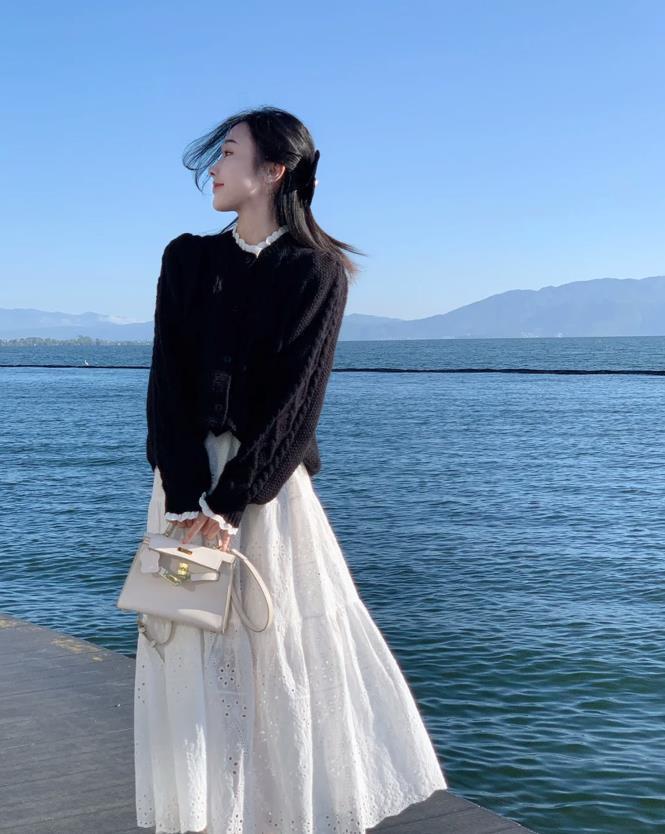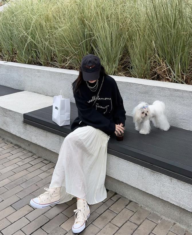 春天的溫柔都是毛衣和長裙給的,喜歡在穿毛衣時配上飄逸的長裙,這樣帶來的視覺反差感,真的絕了。黑白配色組合,也很耐看時髦,腳下踩着一雙帆布鞋,舒適又自在。