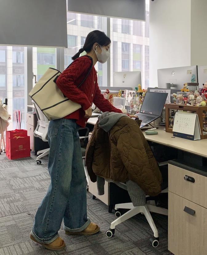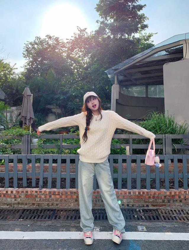 紅色麻花毛衣,穿起來可是很洋氣吸睛的,面料質感也非常棒,早春一件就可以應對不穩定的溫度。選擇牛仔拖地褲相配,那種鬆弛隨性感就出現了。