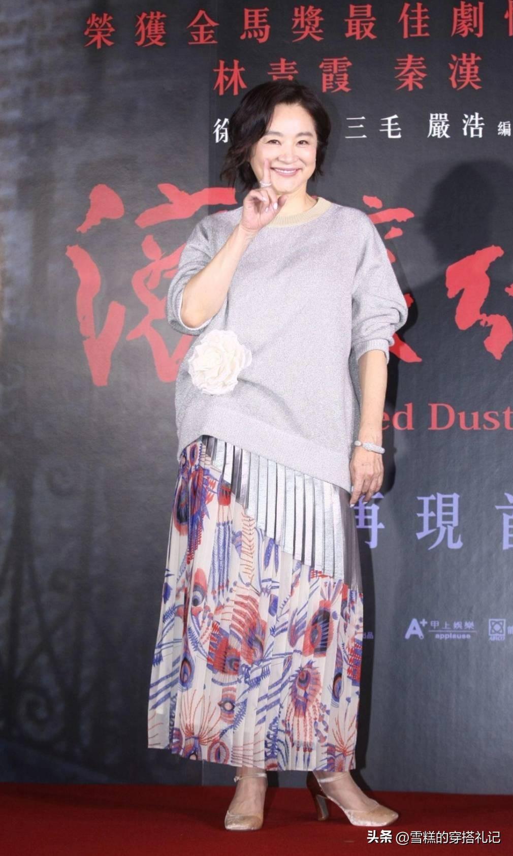 像林青霞這一件印花百褶裙,搭配上淺灰色的衛衣,腰間別一朵牡丹花裝飾,就顯得非常時髦減齡。