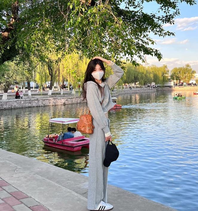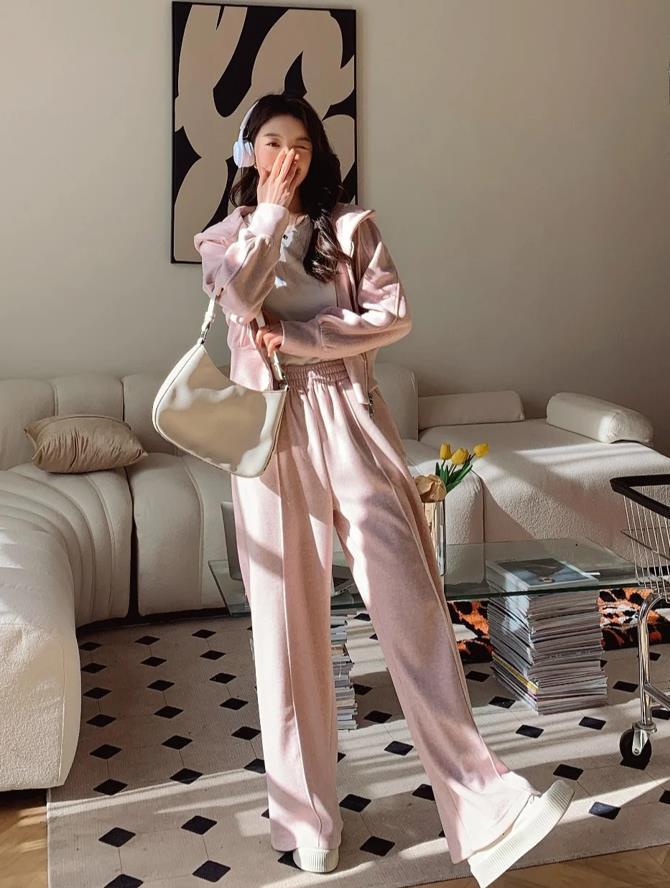 就問,誰能拒絕粉嫩顏色的衣服呢?不是那種容易顯俗氣的粉紅色,而是低飽和的淺粉色,很襯膚色和顯白。運動衛衣外套+運動褲,超級顯溫柔的。