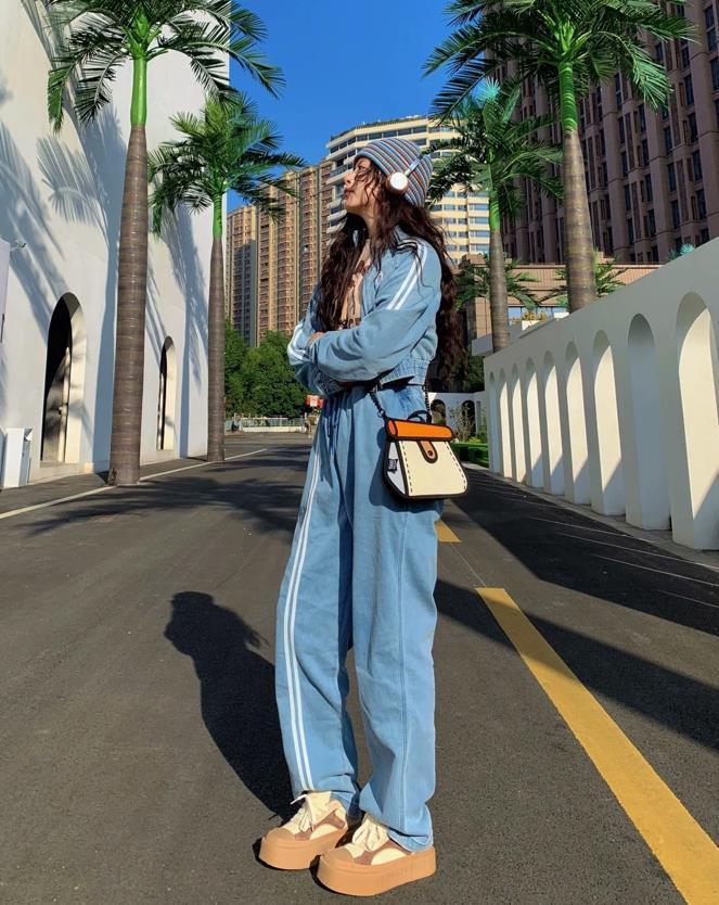又是被藍色迷倒的一天,喜歡這種低飽和度的藍色,真的自帶清爽乾淨氣息,也可以把膚色襯托得十分白皙。運動套裝是上短下長的款式,小個子女生最合適了。
