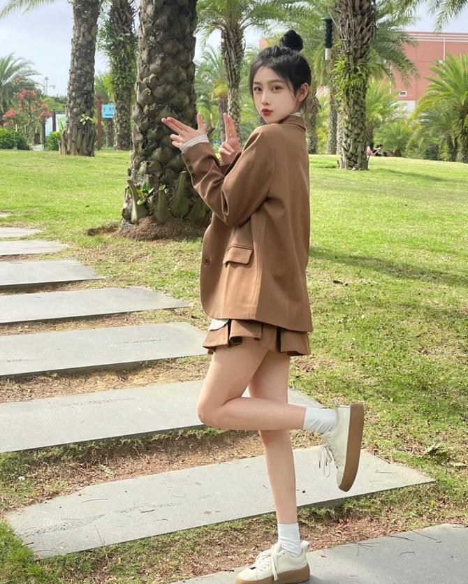 很適合春季的一套學院風套裝,整體看起來就是偏韓系風格的,小西裝套裝的顏色是巧克力摩卡的,有些復古的調調。完全不用想着要怎麼搭配,簡單配一雙運動鞋就可以。