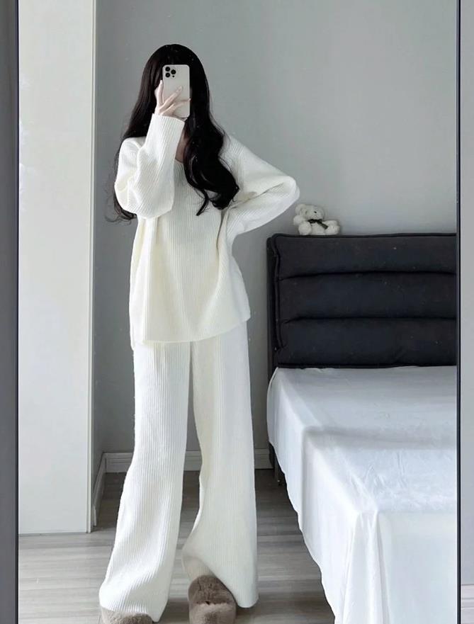 懶人必備的套裝,顏色是奶奶的,有種極簡的溫柔,簡約大氣的款式,針織的面料薄厚適中,柔軟舒適又親膚,經典且百搭。隨便穿都好看。