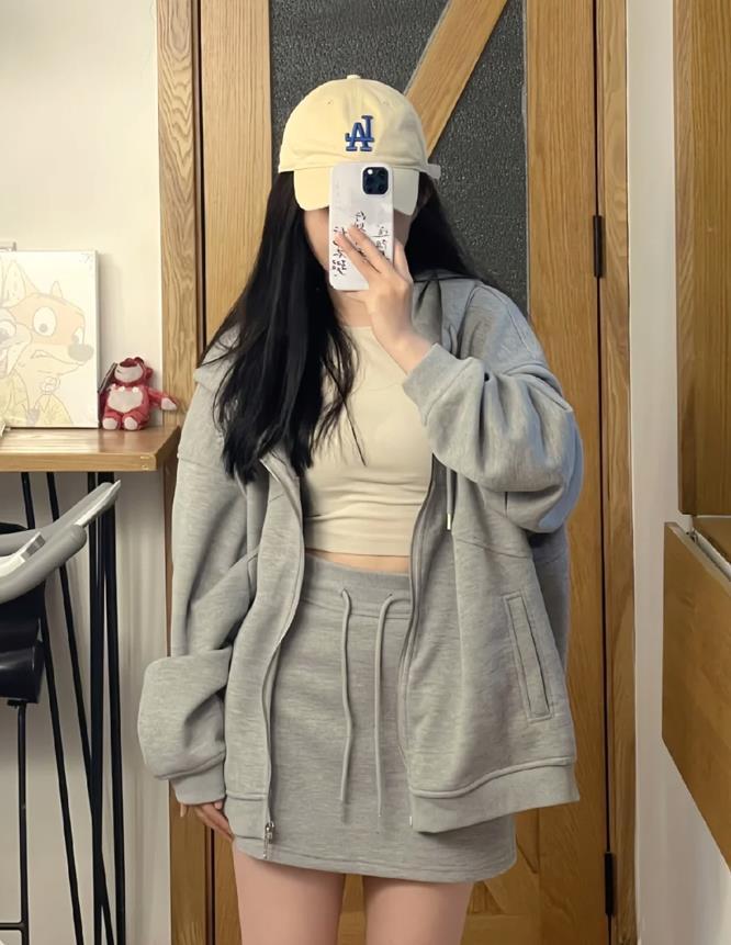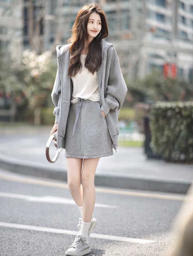 灰衛衣+灰色短裙,成套穿真的太好看了,少女感十足的運動款式,這種寬鬆版型的連帽衛衣外套,適合20度左右的天氣,春季穿起來正好。