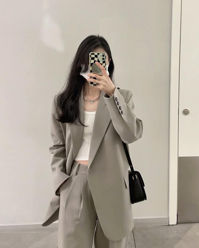在春天,又怎能少了西裝外套呢?奶茶灰這個顏色巨顯高級,很時髦又充滿洋氣,西裝的版型也不會給人太過正式的效果。偏寬鬆的版型,穿得舒適自在又藏肉。