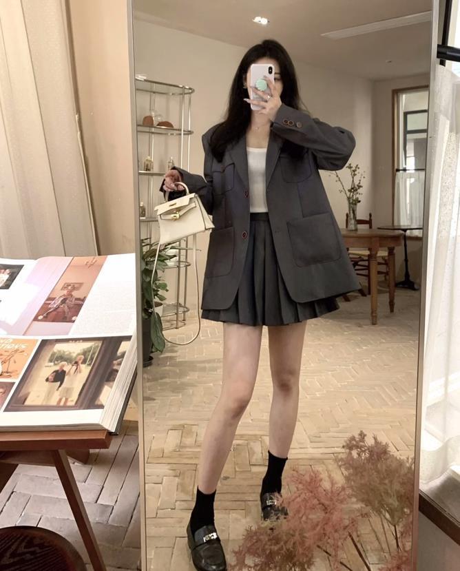 喜歡穿套裝,因爲不用動腦子的感覺實在是太美妙了,鞋子隨便搭也好看,這個灰色西裝裙套裝,穿上身還蠻高級耐看的。帶點學院風的氣息,減齡又不失氣質。