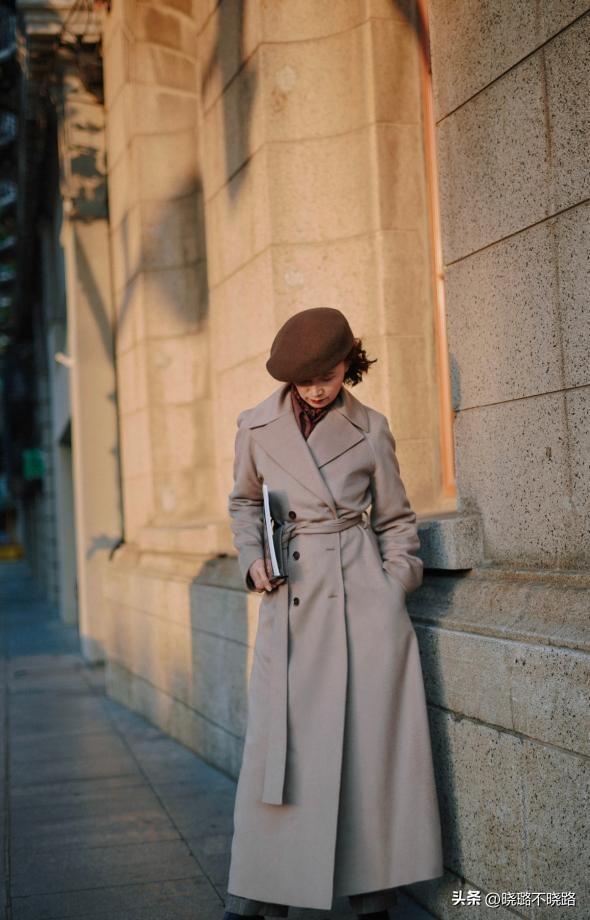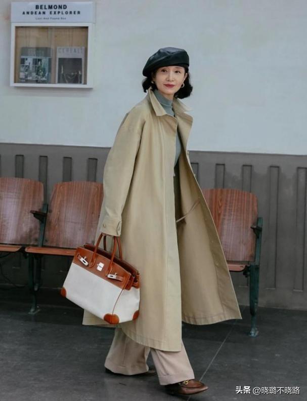 風衣本身帶有的中性感應用在女性身上,可以突顯時尚品味和幹練的氣場。選擇長款繫帶的設計,不僅可以創造出修長的身形線條,避免在穿搭風衣時顯得臃腫、增添視覺負擔,凸顯不必要的臃腫感,同時還能優化身材比例。再搭配優雅的貝雷帽,能賦予女性一種迷人的氣質,增加整體造型的時尚度。
