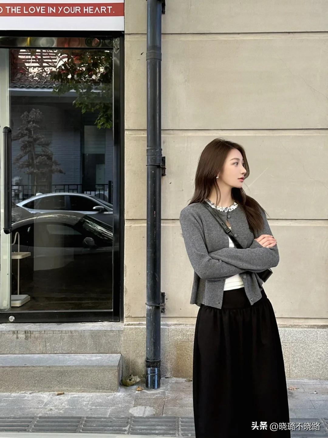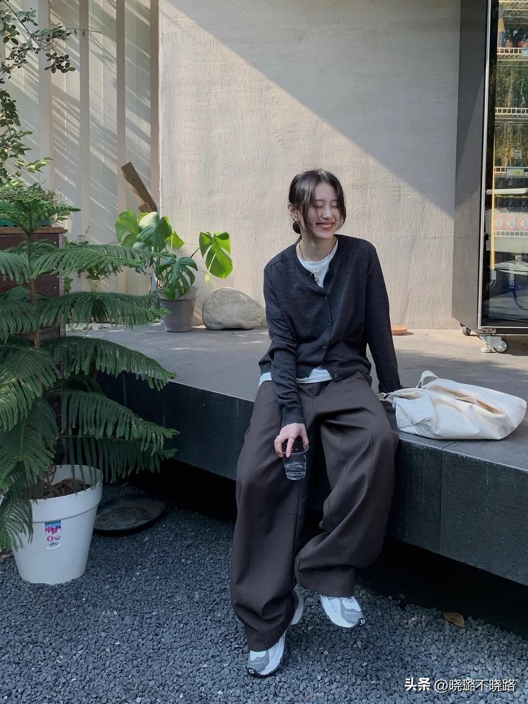 一件灰調的針織小衫搭配白色的內搭,微微露出一點衣領和衣襬,把內外的明暗效果一把子展現,下半身則是寬鬆的西裝闊腿褲,上緊下松整體呈現A字型,視覺上瞧着更顯高。需要注意的是下裝色調比較適合深色的系列,大面積運用也不擔心有橫向的膨脹問題產生。