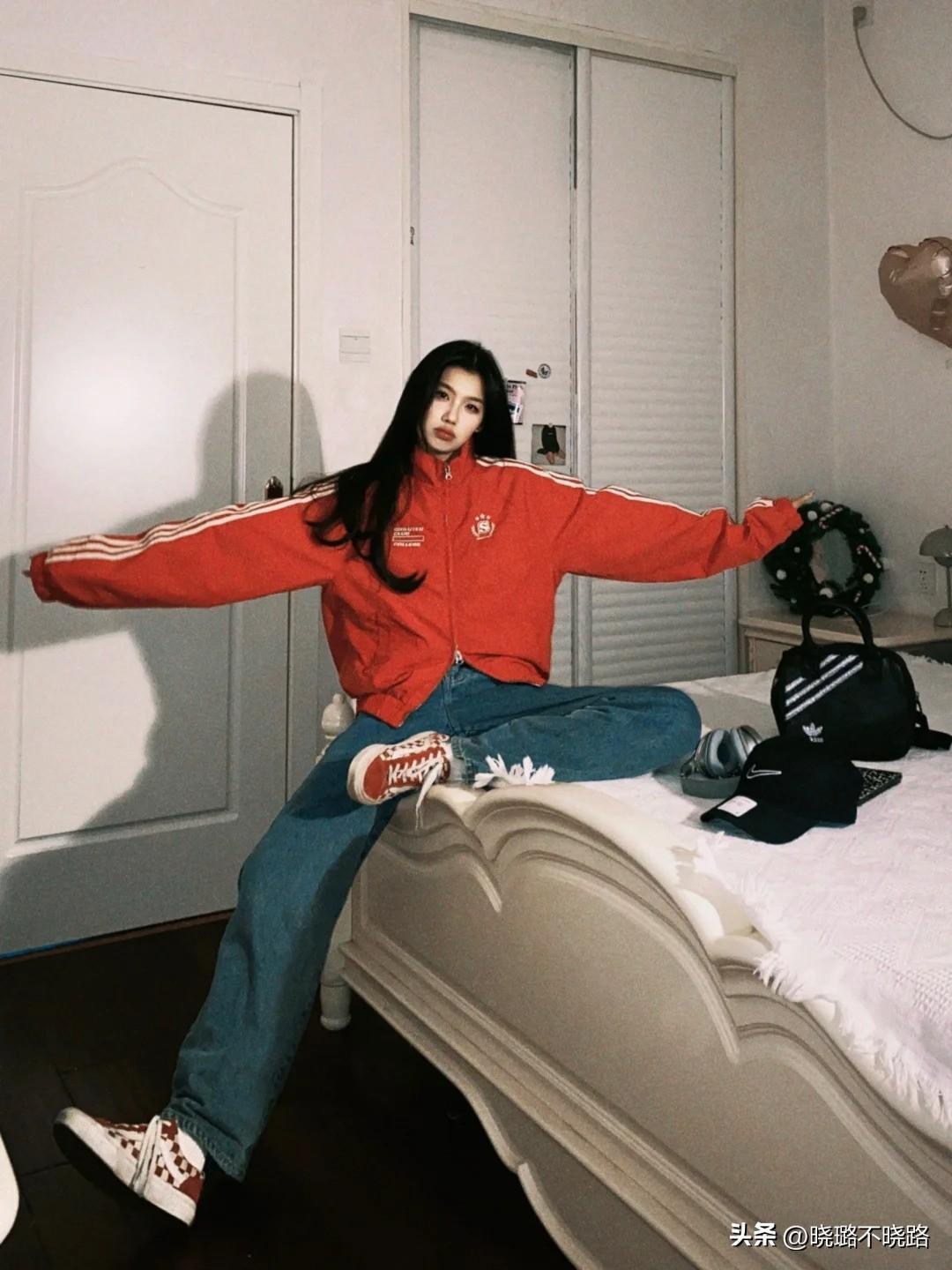 紅色的運動風外套實在是惹眼和減齡!下面搭配一條高腰的牛仔直筒褲,瞬間就把個子拉得高高的,並且紅色與藍色這組經典撞色cp又能牢牢抓住看者的視覺注意力,在春天釋放出不可比擬的時尚表現力。