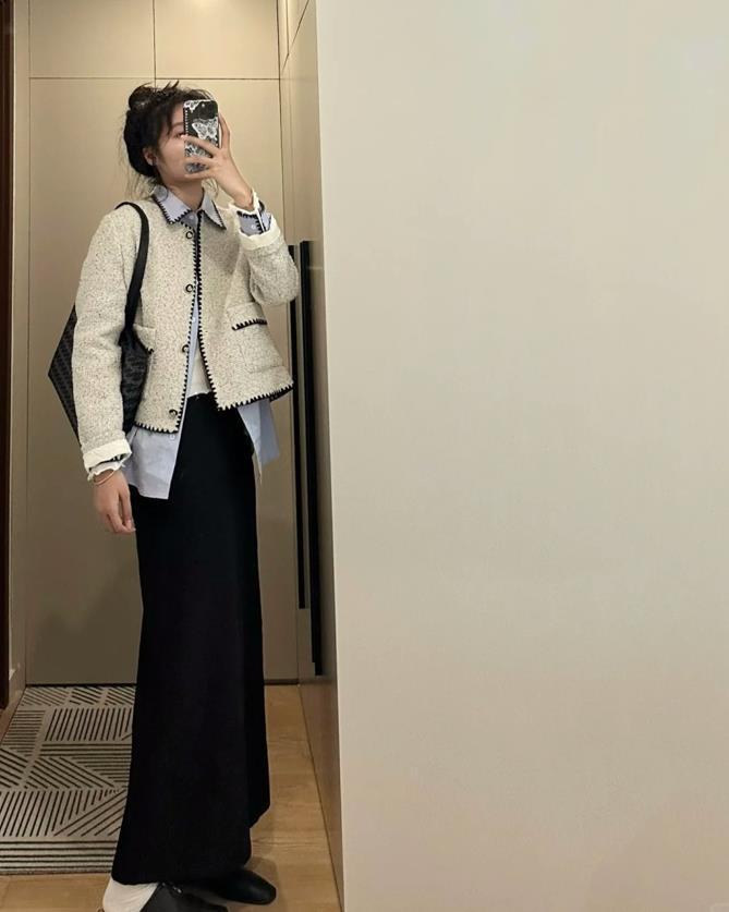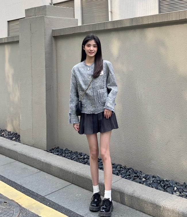 話說回來,小香風+百褶裙也太好看了吧?特別是配短款百褶裙,感覺整個人都變得高挑起來。清冷灰的小香風,低調高級又很顯氣質,它的版型做的很好,不會顯得很大,就是剛好的那種。