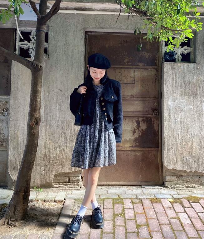 小香風外套和碎花裙真的是絕配啊,黑色的短款小香風外套,最適合小個子女生穿了,搭配膝蓋以上長度的碎花裙,輕鬆打造出高挑感。腳下穿的皮鞋也是厚底的,可以在一定程度上拉長你的腿部線條。