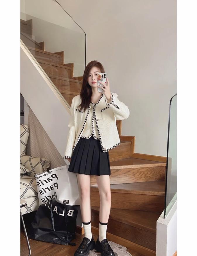 黑白配的穿搭也太耐看了吧?很高級又充滿氣質感,這一件奶白色小香風外套看起來就很不錯,隨便穿就顯貴氣。搭配黑色或同色的百褶裙,完美!