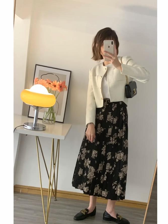 白色小香風外套+黑色碎花裙,黑白配色,就是很耐看時髦,春天是一個萬物復甦的季節,就是要穿得美美的纔行。