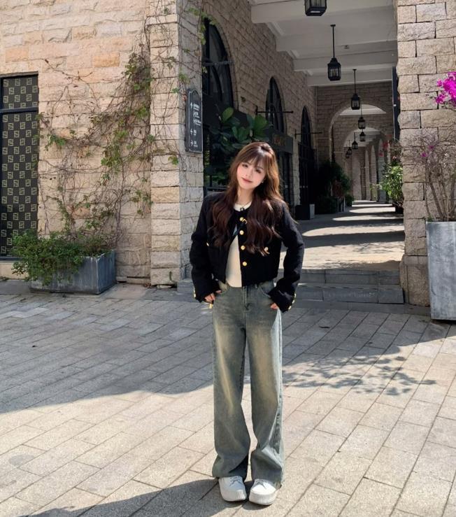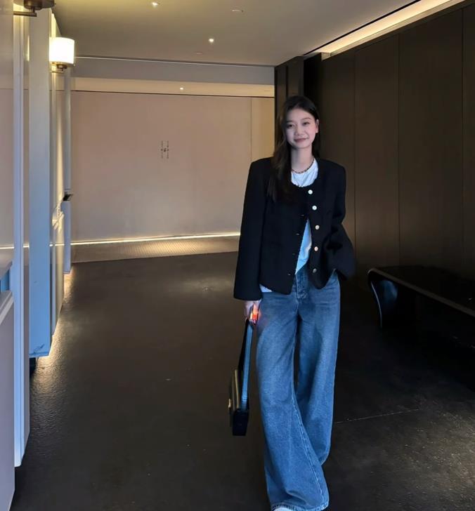 黑色的小香風外套,是真的挺百搭的啊,而且,加上寬度適中的版型,穿起來也非常顯瘦。結合白t和牛仔闊腿褲來配,一整個又多了幾分鬆弛感。