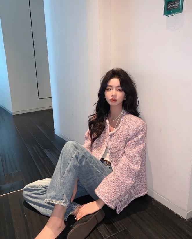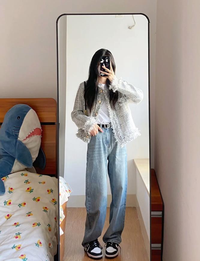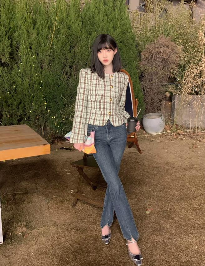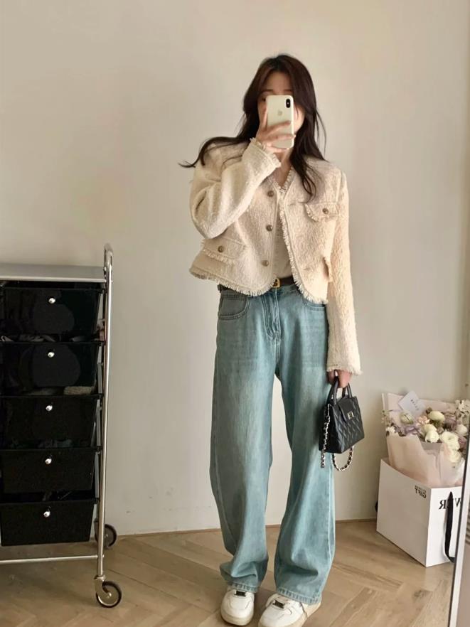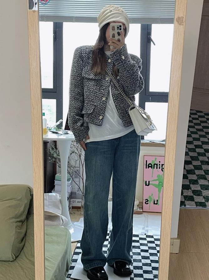適合小個子女生的一套,短款小香風外套+牛仔長褲,上短下長的搭配就是能很好優化整個身材比例。150的小個子,也可以穿出160的既視感。