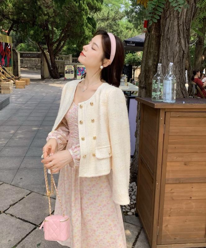 在春天又怎能沒有一件小香風外套呢?乾淨的奶白色,穿起來整個人都變得溫柔起來了。內搭粉色碎花連衣裙,真的是又顯貴又好看,溫柔千金感十足,通勤約會都很合適。