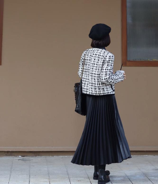 黑白格紋小香風外套,很經典百搭,領結的設計是點睛之筆,瞬間就把氛圍感拉滿了。搭配黑色百褶半身長裙,溫柔又高級,還帶着幾分屬於法式的浪漫風情。