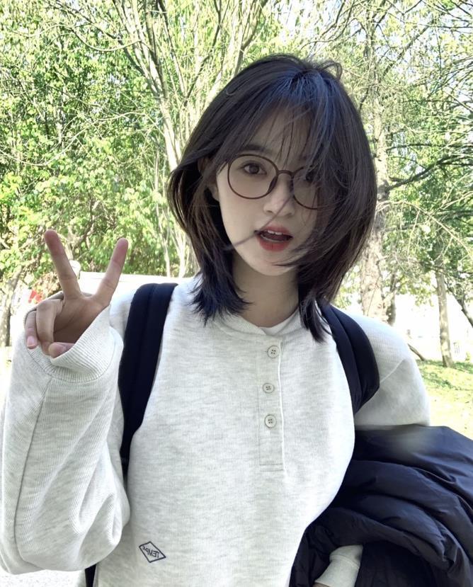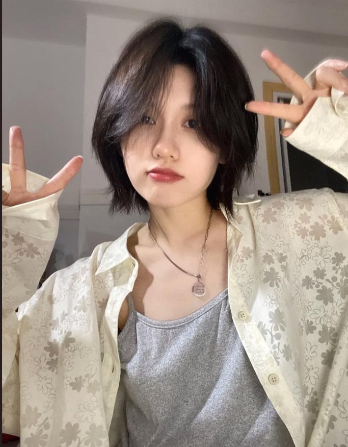 帶點空氣感的日系短髮,看起來就很減齡,接近髮尾處進行了打薄,因此髮尾呈現出一點內扣的弧度感,搭配空氣法式劉海,很好對臉型進行了修飾。