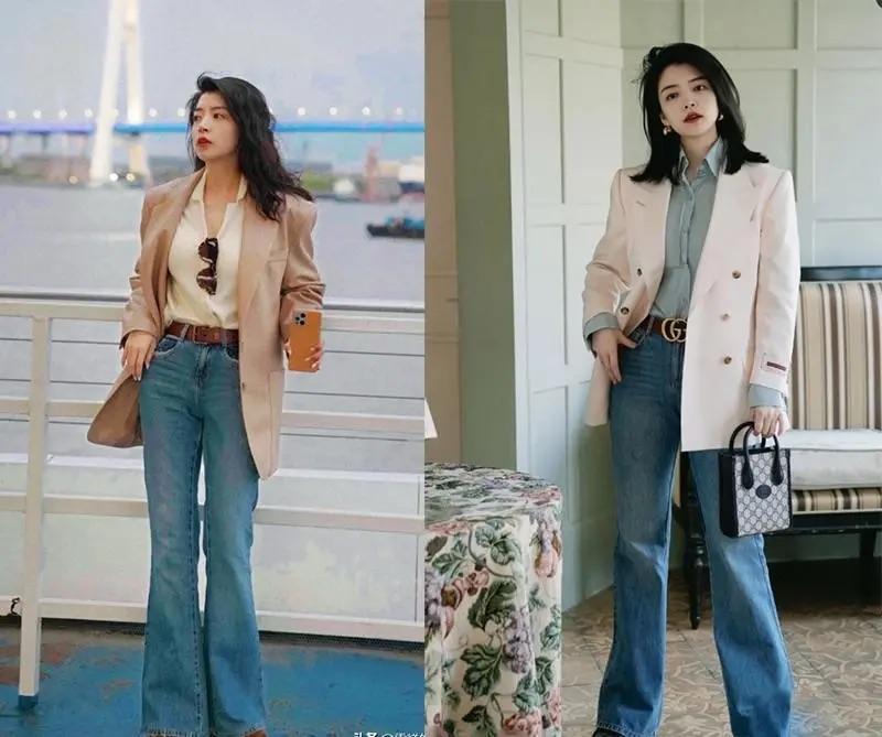 像這種高腰的牛仔褲,我們可以搭配微喇褲的款式,或者直筒款式、闊腿款式。牛仔褲想要穿出個性感,我們可以搭配腰帶點綴,顯腿長又更時尚。