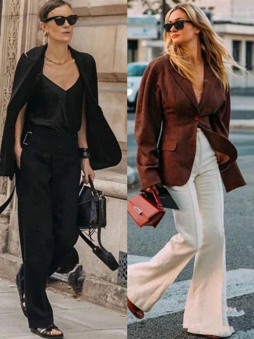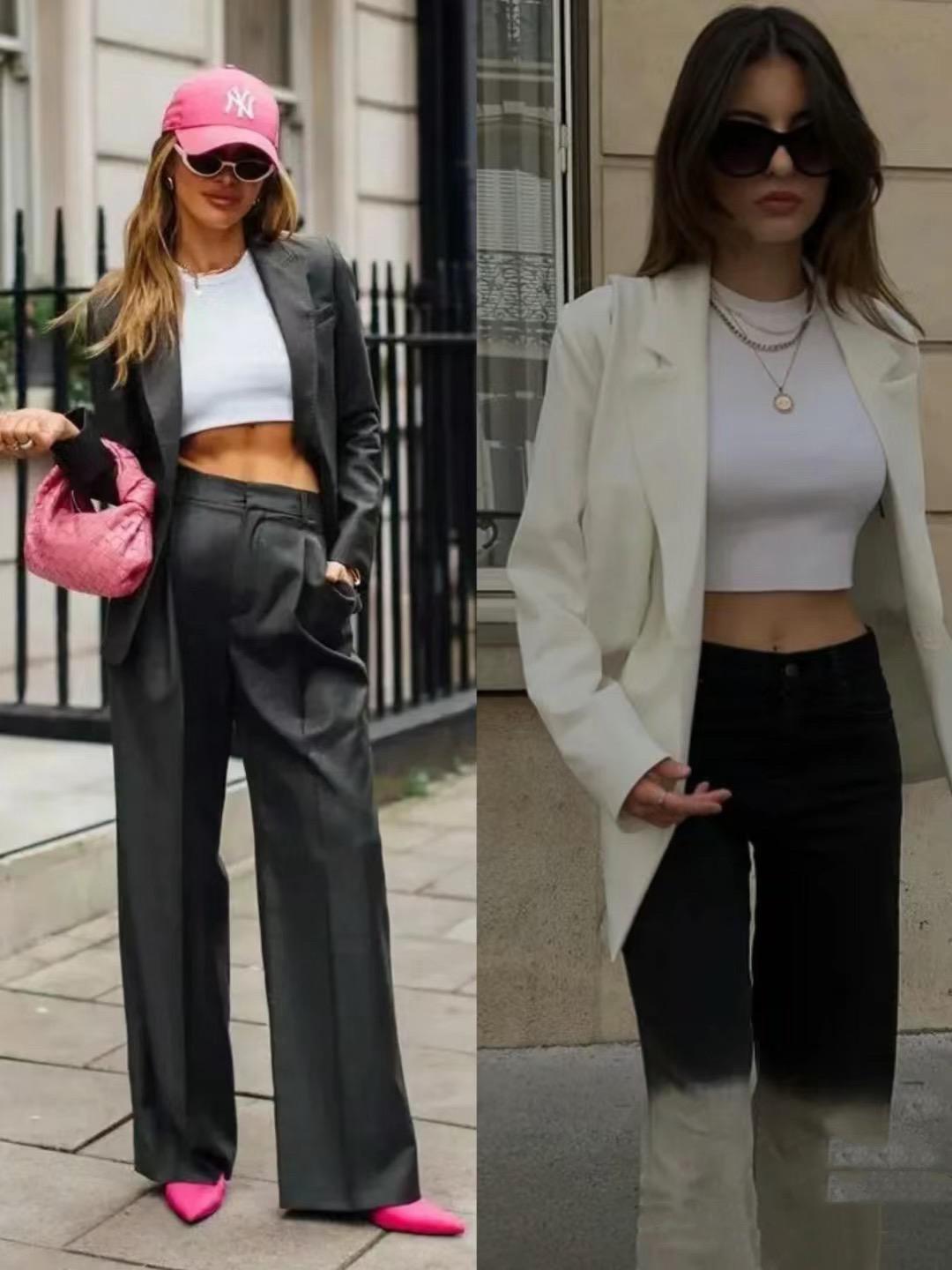 寬鬆的西裝外套,配上修身的背心/內搭,可以形成一種外鬆內緊的方式。修身的背心/內搭,更加利落顯瘦一些。尤其是這種經典的黑白配、給人一種帥氣醒目的美。