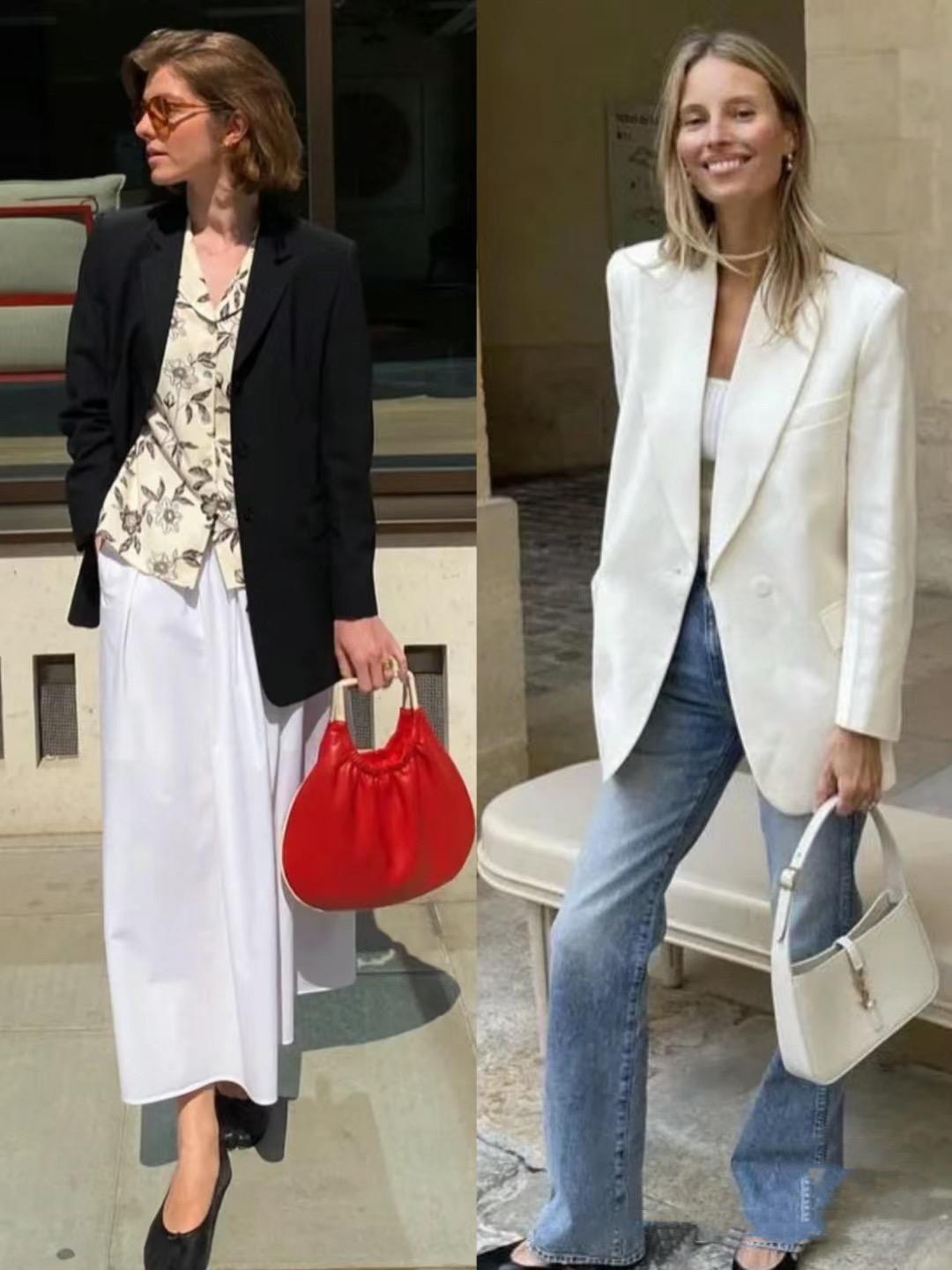 寬鬆一點的白色西裝外套,可以搭配稍微修身的直筒牛仔褲。這種上松下緊的組合,還可以顯得我們雙腿更加纖細修長,對於身材比例的修飾性更強。