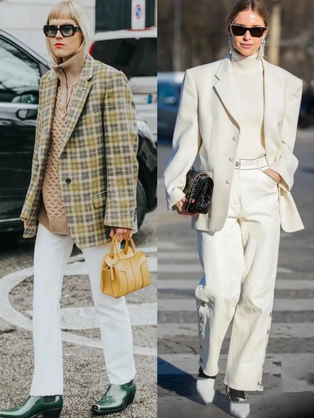 稍微寬鬆的小廓形西服外套,帶來一種更加自信大方的美。我們可以用西服外套配高腰的直筒小白褲,簡簡單單的穿搭組合,顯得整個人更加年輕了,直筒小白褲在春天也很百搭。