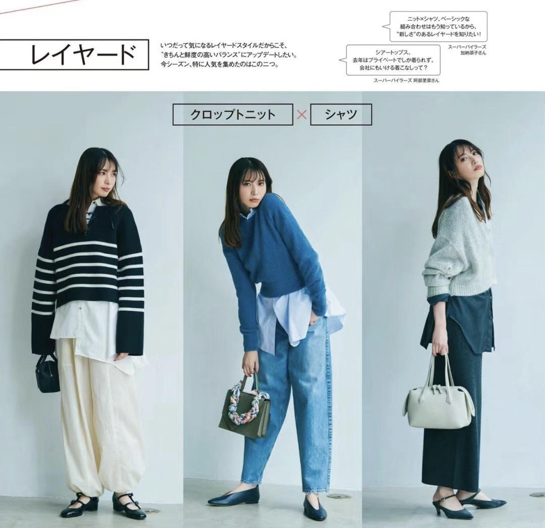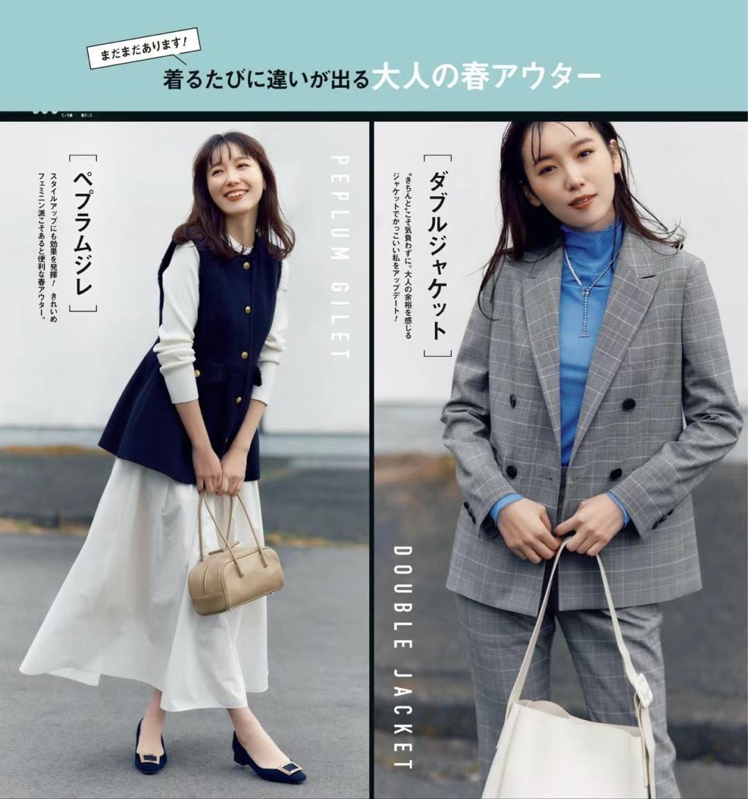 在日雜風穿搭中,雖然運動鞋也佔據了半壁江山。但對於40+的女人來講,春天裏還是更加適合輕盈且修飾腿型的低跟鞋。