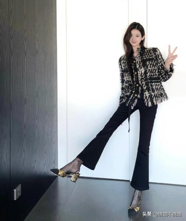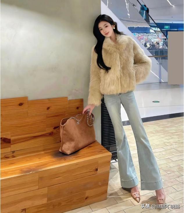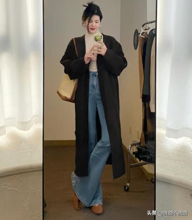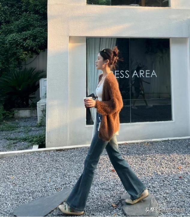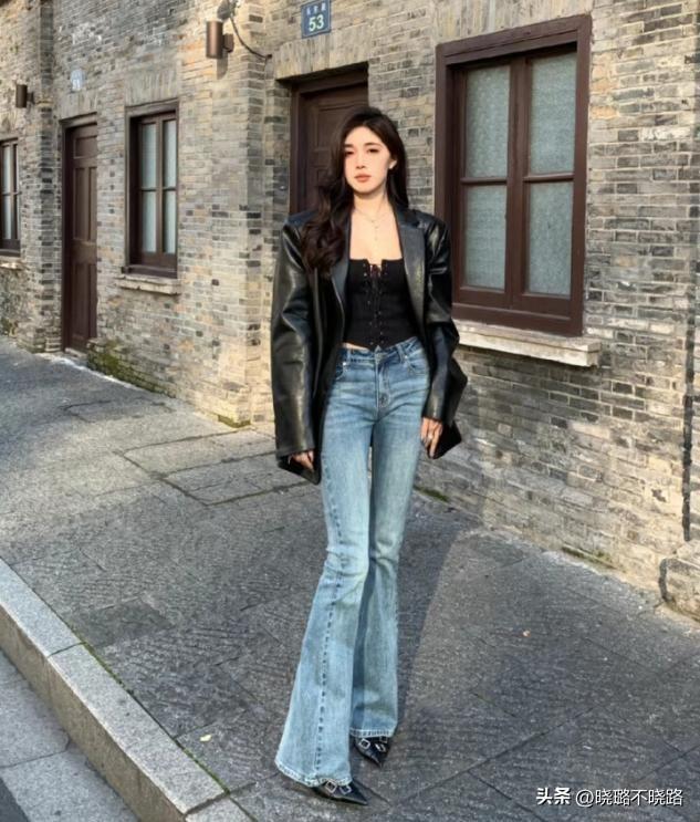 上衣的款式設計也有細節,比如我們的上衣偏厚的話,就可以利用外套來對比單層喇叭褲的厚度,喇叭褲上身偏緊,腿部放寬的線條對比感,本身就能夠設計出身材合適的凹凸感,穿衣成熟又顯得個性。