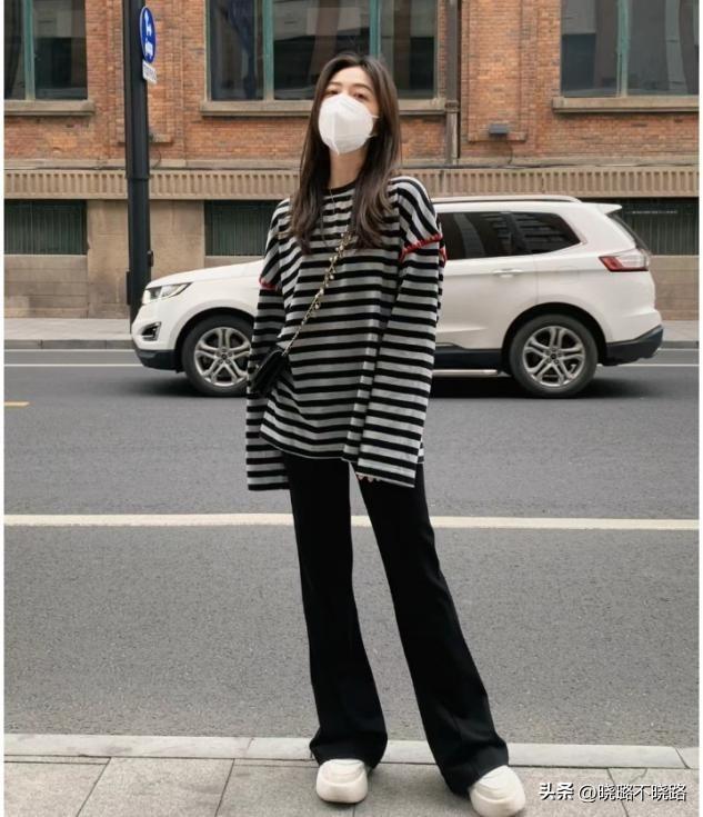 上衣款式的疊加穿搭,讓單件喇叭褲的造型更顯層次優勢,而且單層褲裝的穿法更好縮減你的腿型膨脹感,腿長比例更加明顯,推薦用厚底的平底鞋或者是低跟鞋來維護線條,穿衣組合井井有條。