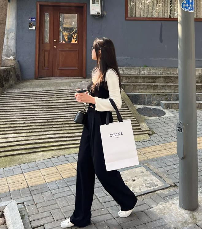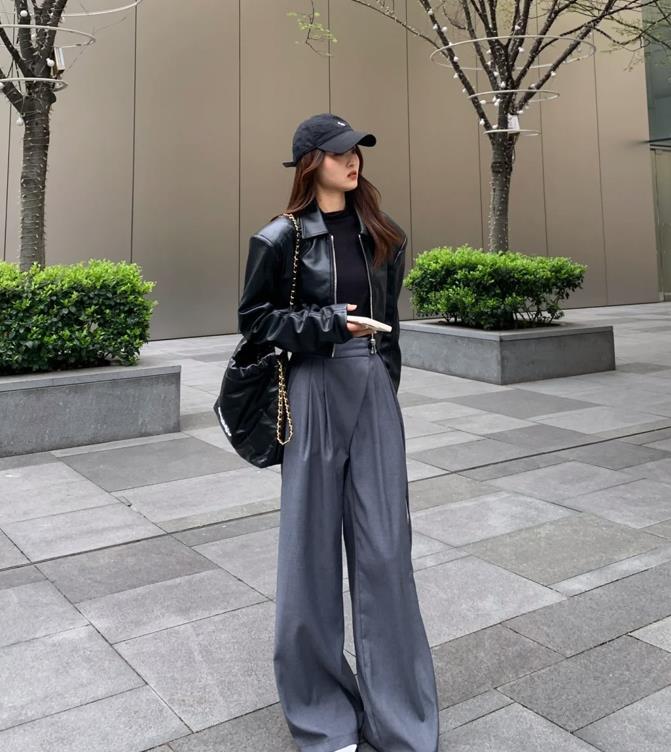 西裝材質的闊腿褲,垂墜感和質感方面也是很棒的,和牛仔面料一樣,穿起來的舒適度也不差。黑色的西裝闊腿褲,可沒有傳統西裝褲那般顯正式,反而多了幾分休閒和隨性。