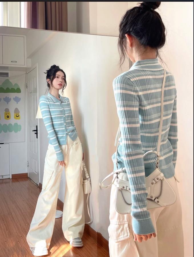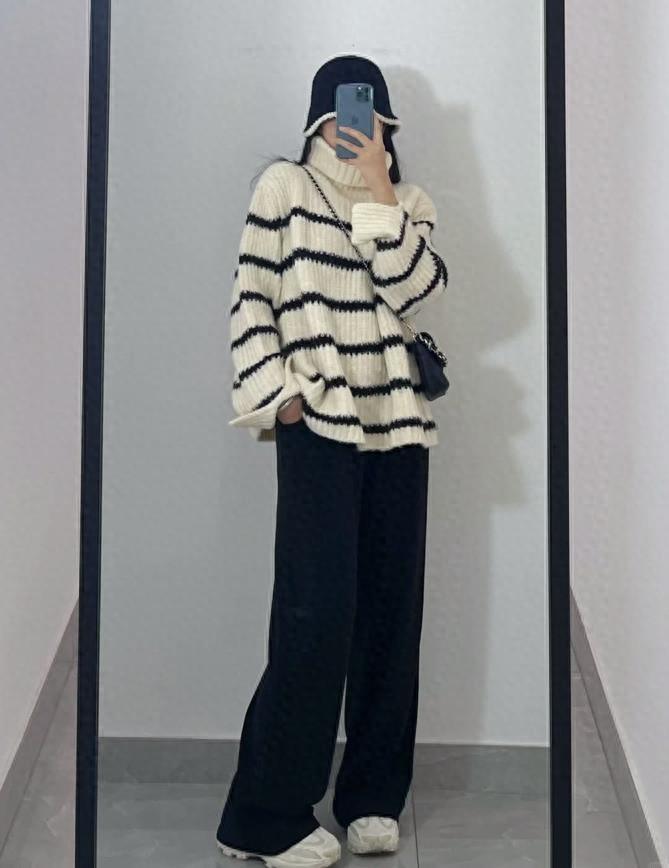 春季,就是要穿針織啊,藍白相間的針織衫,因爲融入了條紋而變得有趣,也不再單調。白色工裝闊腿褲和運動鞋,輕鬆拿捏了韓系休閒風。