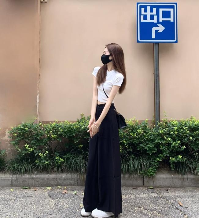 黑白配的搭配,那真的是太時髦和高級了,都是屬於基礎色,無論怎麼搭配都是可以的。白色短t+高腰黑色闊腿拖地褲,下身的比例線條瞬間就拉長了,顯腿長又能打造出高挑感。