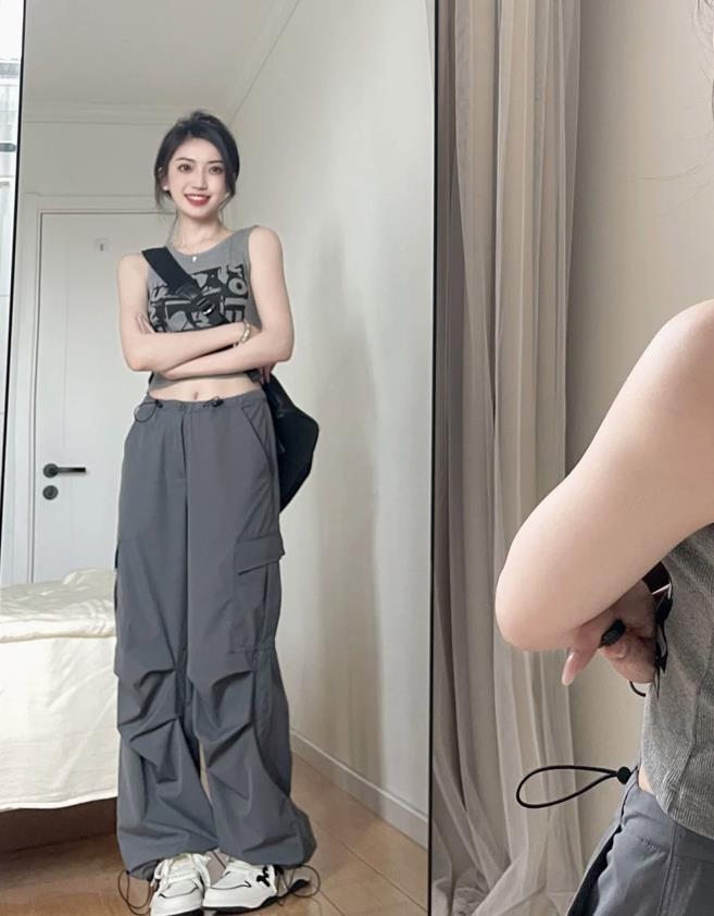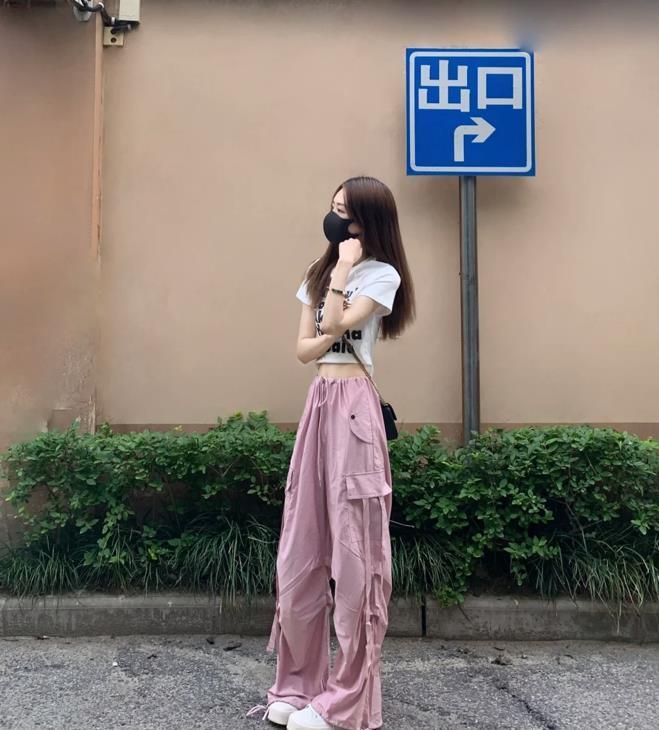 這一套辣妹風格的穿搭,上身身材比例好的姐妹就不要錯過了,淺粉色背心和灰色的工裝闊腿褲,真的是又甜又褲。運動鞋的加入,只會讓整個造型的風格多了一些休閒的味道。